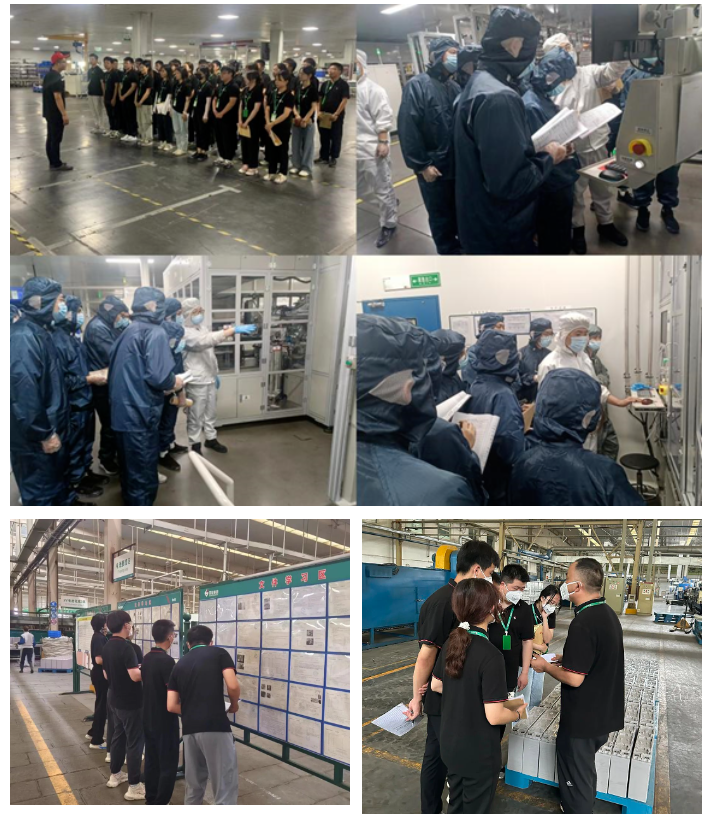 产品线师傅带领新员工了解各车间的生产流程和工艺原理,学习各关键工序的控制指标。上一届入职同事分享工艺原理、产品开发及设计原理、产线布局及工艺设备的有关知识和工作经验,帮助新员工加快生产过程与管控理解。