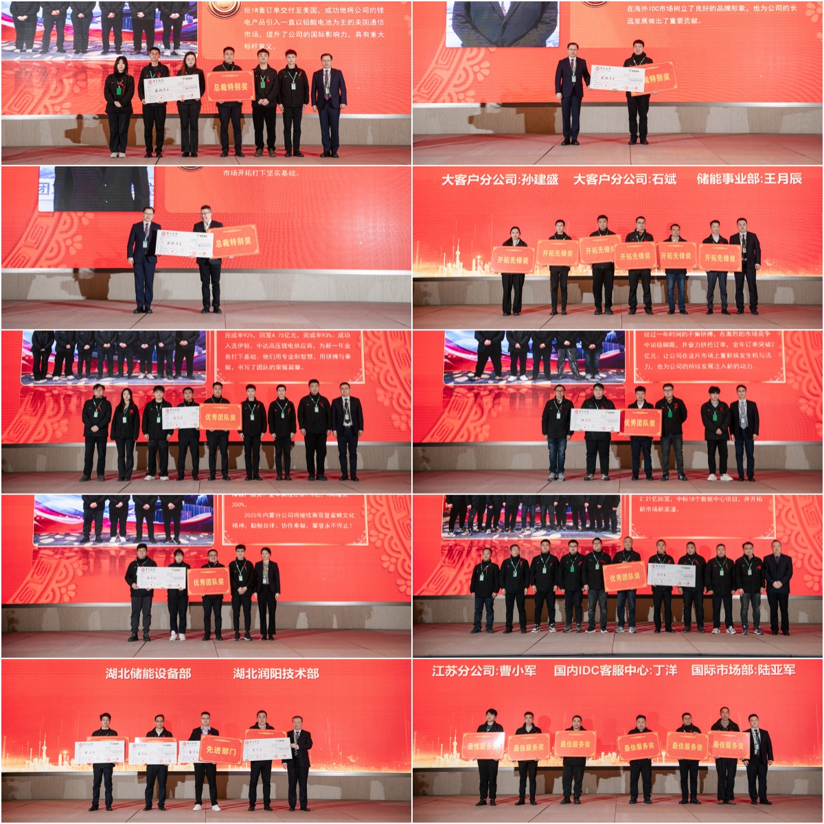 2024年,双登涌现出一批优秀团队与个人,他们用自己的行动和丰硕的成果,为双登谱写了出彩篇章。大会对过去一年做出突出贡献和优异表现的先进集体和优秀个人进行现场表彰,先后颁发“总裁特别奖”、“管理先进部门”、 “优秀团队奖”、“开拓先锋奖”、“最佳服务奖”等奖项,希望全体双登人一起向他们学习,再接再厉,再创辉煌!