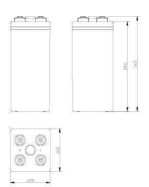 | Type | Rated Voltage V | Maximum Total Mass kg | 10h Rate Discharge | 5h Rate Discharge | 1h Rate Discharge | Size mm | ||||||||