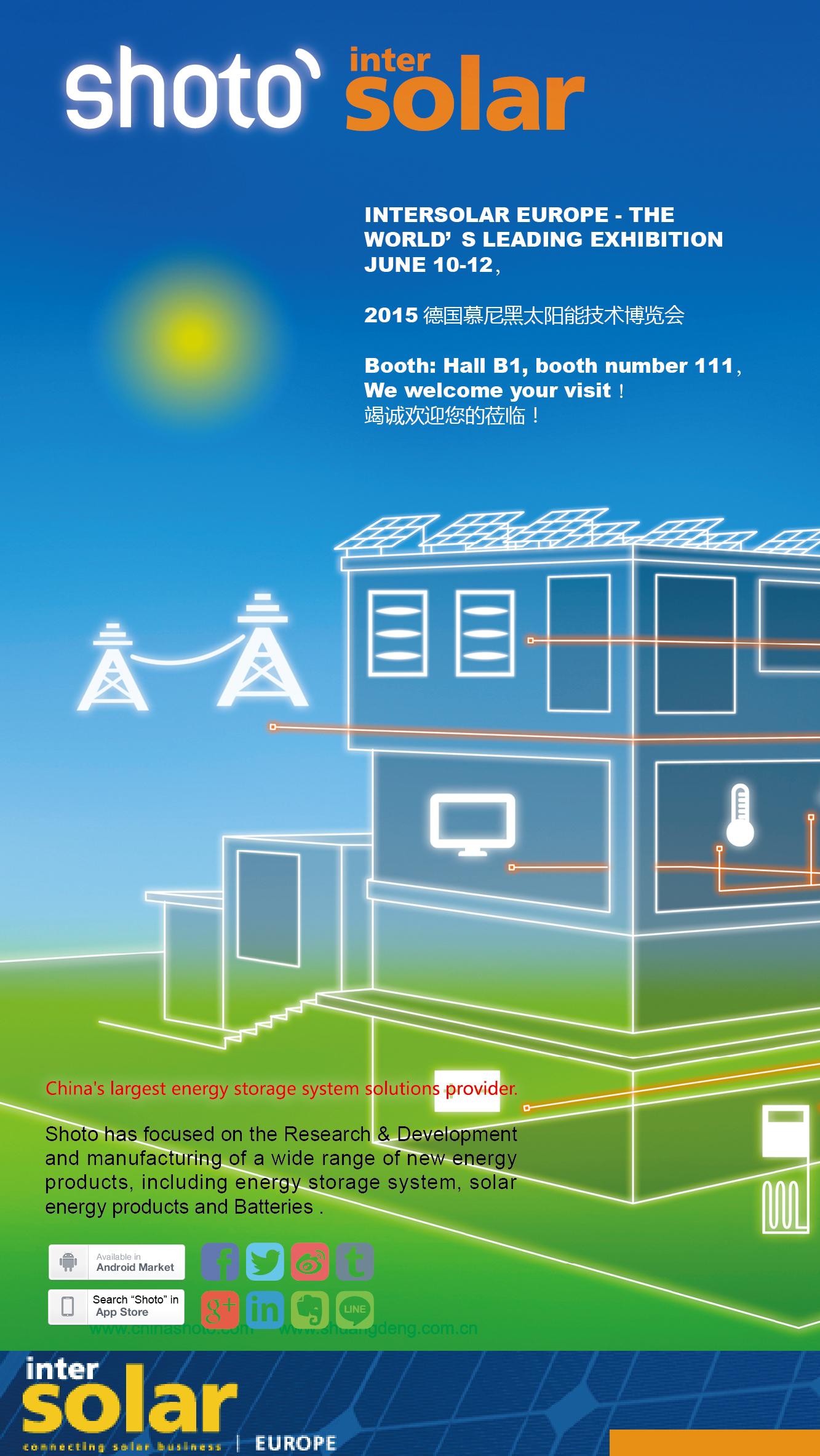 Shoto, the leading supplier of green energy storage integration services in the age of big data,China's leading high-tech New Energy enterprise group. Will participate in INTERSOLAR EUROPE - THE WORLD’S LEADING EXHIBITION, 10-12 June 2015, Booth: Hall B1, booth number 111.