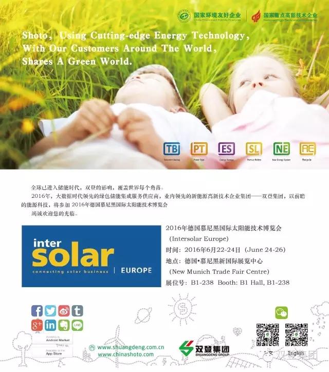 In 2016, Shoto, the leading supplier of green energy storage integration services in the age of big date, Chinese leading high-tech new energy enterprise group. We will use forward-looking energy technologies, participate in Intersolar Europe 2016.